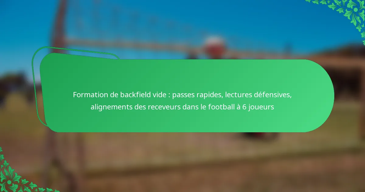 La formation de backfield vide dans le football à 6 élimine les running backs du backfield, mettant l’accent sur une stratégie orientée vers le passe. Cette configuration permet des passes rapides qui exploitent les déséquilibres défensifs, permettant au quarterback de distribuer rapidement le ballon aux receveurs. En lisant efficacement les alignements défensifs, les équipes peuvent ajuster leurs tactiques pour capitaliser sur les faiblesses et améliorer l’efficacité offensive.