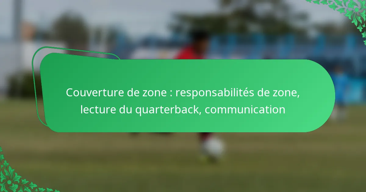 La couverture de zone implique que les défenseurs couvrent des zones désignées, leur permettant de réagir au jeu offensif plutôt que de se concentrer uniquement sur un receveur spécifique. Le principe principal est de maintenir un équilibre entre la défense contre la passe et le soutien à la défense contre la course. Les défenseurs doivent communiquer efficacement pour s’assurer qu’ils couvrent leurs zones sans chevauchement de responsabilités.